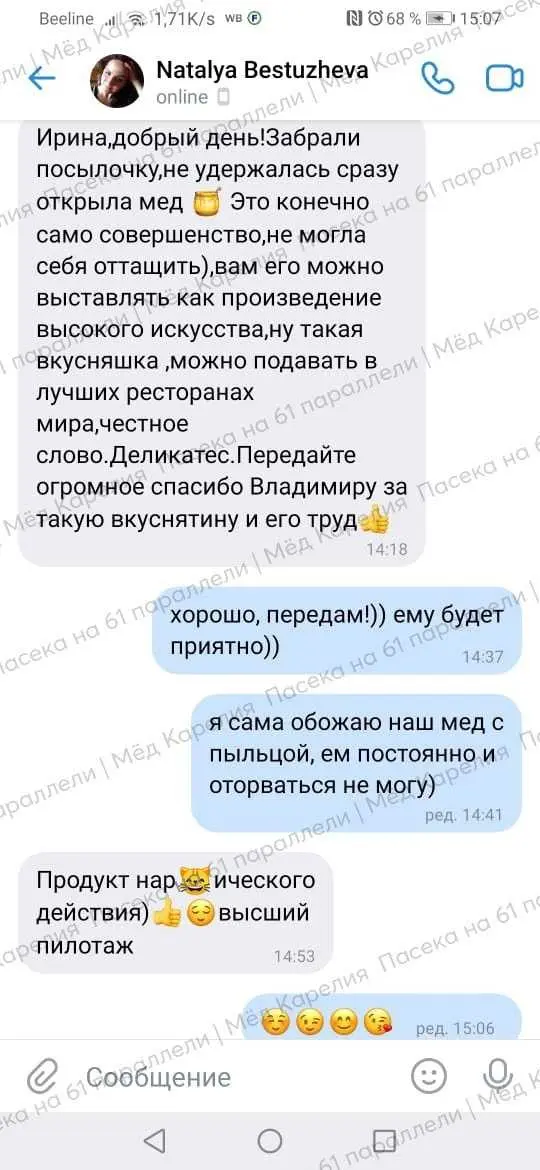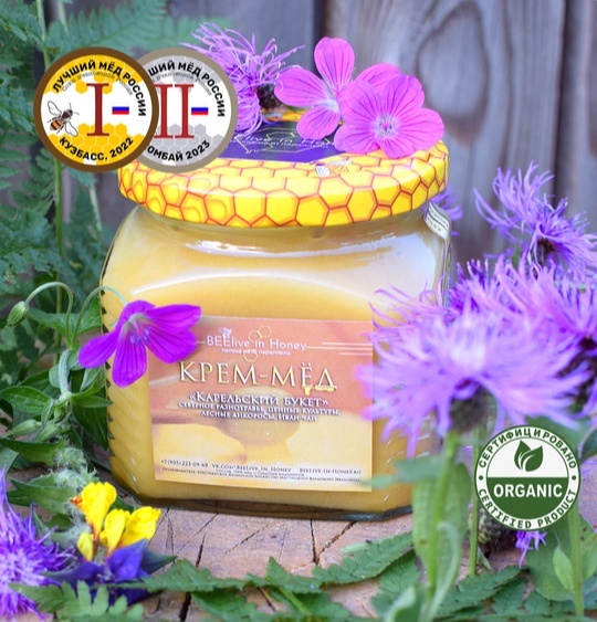 Полнота вкуса и аромата нашего меда напоминает о природе и спокойствии (безмятежность, умиротворение, идиллия) места, в котором он собран, - о деревенском цветочном луге и таежном лесе.